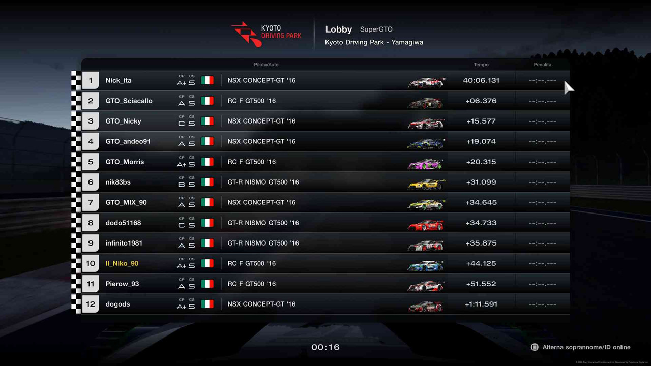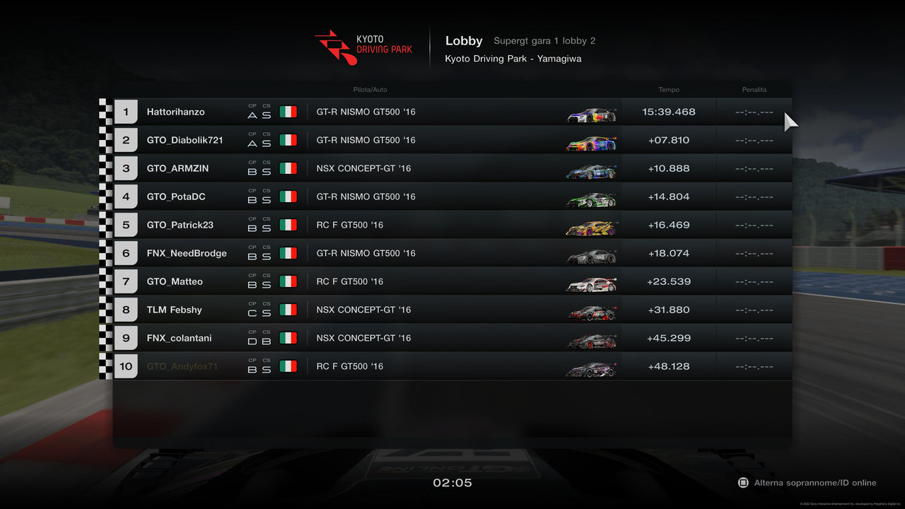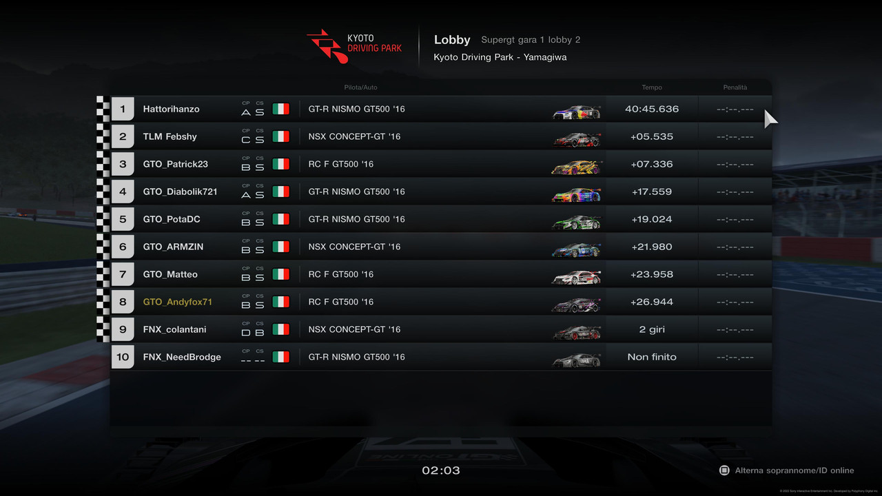 PILOTA TEMPO TOTALE PEN PUNTI Hattorihanzo 40:45.636 -1 punto 25 Febshy +05.535 20 GTO_Pat23 +07.336 16 GTO_Diabolik721 +17.559 12 gymsy +19.024 11 GTO_Matteo +23.958 10 GTO_Andyfox71 +26.944 9 Armzin85 +26.980 8 colainter + 2 giri +10 sec 7 NeedBrodge DNF 0 LG_Kobra DNF 0 Retrocedono in lobby 2 : Pierow_92, nik83bsPromossi in lobby 1 : hattoriHanzo, GTO_Diabolik721