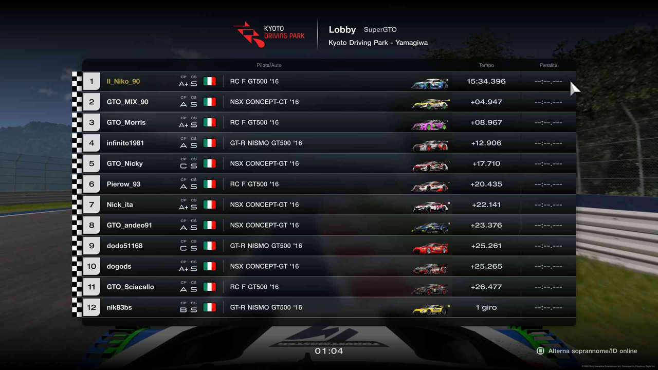 PILOTA AUTO Nick_ita Honda RAYBRIG NSX CONCEPT-GT Il_Niko_90 Lexus RC F GT500 GTO_MIX_90 Honda RAYBRIG NSX CONCEPT-GT GTO_Nicky Honda RAYBRIG NSX CONCEPT-GT GTO_Morris Lexus RC F GT500 GTO_Sciacallo Lexus RC F GT500 GTO_andeo91 Honda RAYBRIG NSX CONCEPT-GT Infinito1981 Nissan GT-R NISMO GT500 dodo51168 Nissan GT-R NISMO GT500 Hattorihanzo Nissan GT-R NISMO GT500 GTO_Diabolik721 Nissan GT-R NISMO GT500 Dogods Honda RAYBRIG NSX CONCEPT-GT Lobby 2