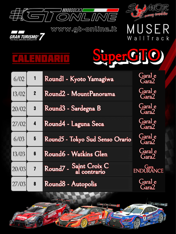 GTOnline è lieto di presentarVi un nuovo campionato all’insegna della velocità e della leggerezza, a bordo di auto Superveloci, “SuperGTO” è il campionato che stavate aspettando!! Prova libera, Qualifica, Gara Sprint e Completa, più una Endurance saranno svolte nelle serate in calendario.